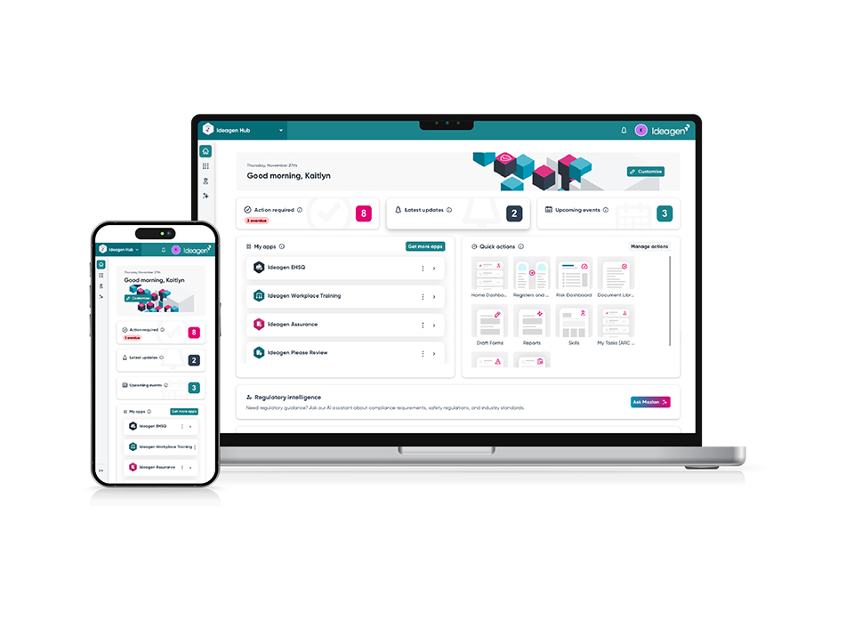It centralizes tasks, notifications, analytics and business intelligence while connecting all Ideagen tools with embedded AI, automation and integrations.