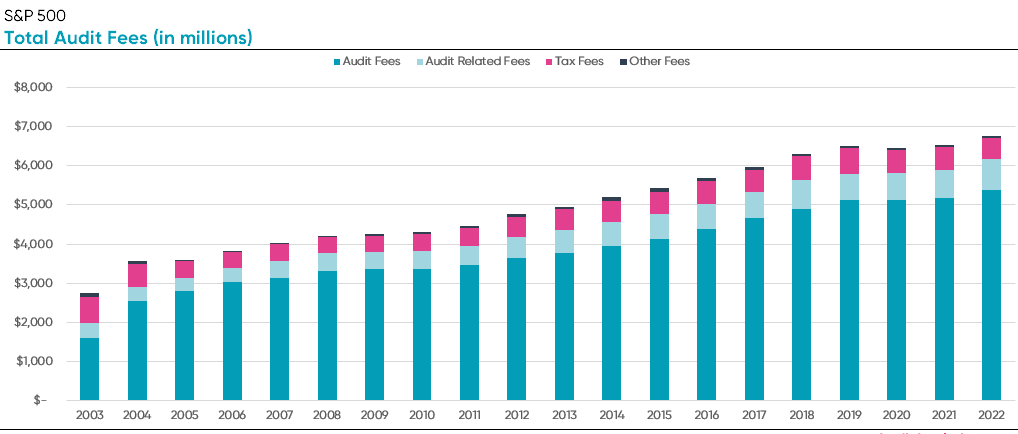 Since the COVID-19 pandemic, revenue for the S&P 500 has grown at an exceptional rate, comparably to large accelerated filers overall as shared in our report. Total revenue for the S&P 500 has increased 33% since FY2020, reaching nearly $15.7 trillion in FY2022. Consequently, the amount of audit fees these top companies pay as a proportion of their revenue has dramatically decreased.