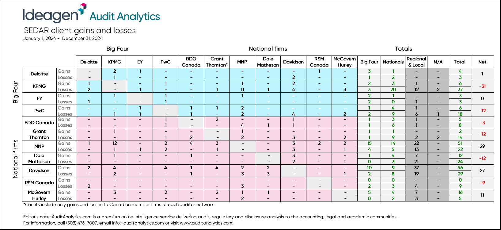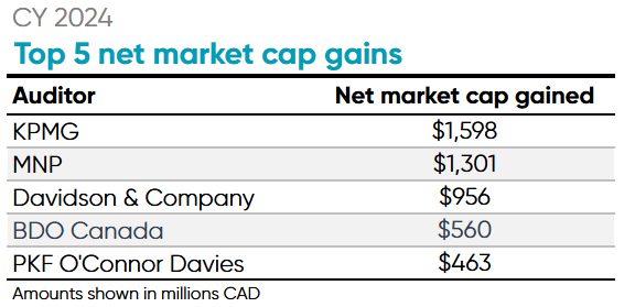 Davidson & Company was the leading auditor for total new engagements among Canadian auditor changes in 2024. Davidson engaged 56 new clients throughout the year. Despite engaging the most new clients for 2024, Davidson trailed in net auditor engagements to rival firm MNP who had a total of 29 net engagements.