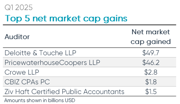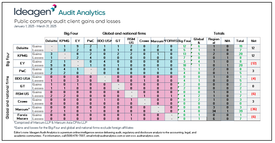 Overall, the top ten global and national audit firms gained 66 and lost 100 clients during Q1 2025.