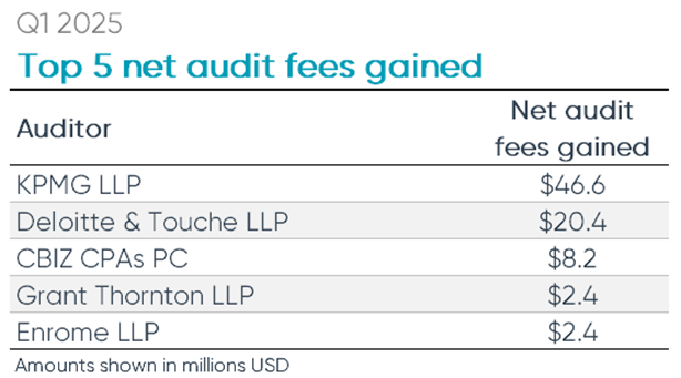 In terms of net audit fee gains, KPMG, was the leader with a net of $46.6 million from their Q1 2025 clients. Their largest client gained in terms of audit fees was QuidelOrtho Corp., which paid $10.9 million in audit fees for fiscal year 2024.