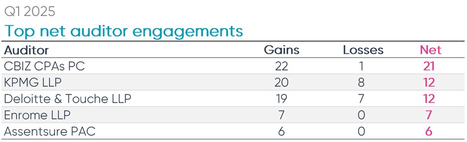 The majority of the Big Four had positive quarters with Deloitte, KPMG and PwC all gaining clients on net. KPMG had an impressive 20 new engagements but also lost 8 clients, amounting to a net gain of 12 clients. There was a notable increase in auditor switching among the top firms from Q4 2024 where BDO led in client gains with four net clients gained and where there were only 22 new engagements among the top ten global and national firms.