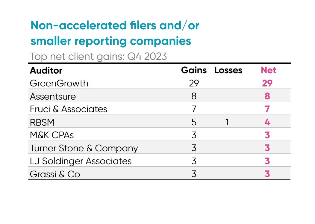 - KPMG gained the most large accelerated filer clients in Q4 with two new clients.