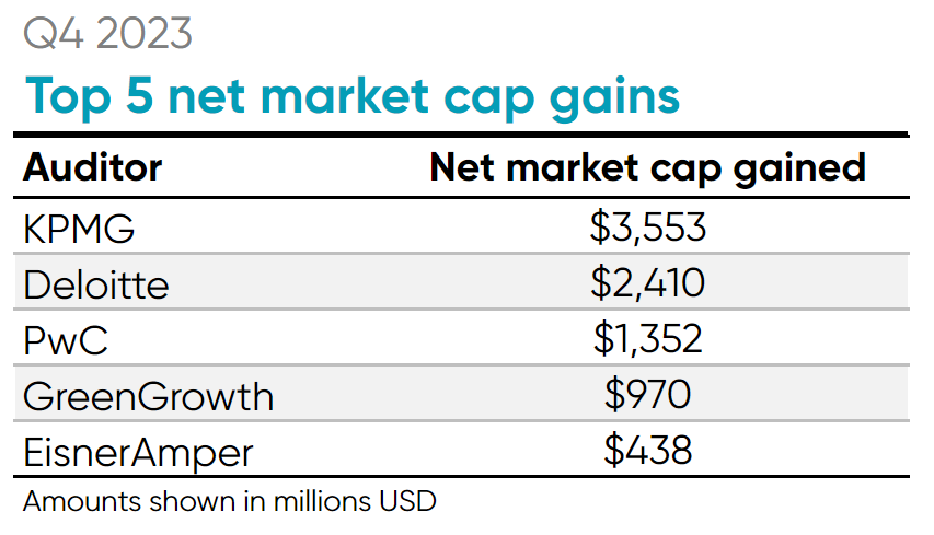 KPMG saw the largest net market cap gains from their new engagements in Q4, bringing in companies with a net market cap of $3.5 billion. Their largest new client was Arrowhead Pharmaceuticals, a California-based biopharmaceutical company that added a market cap of $2.8 billion to their total.