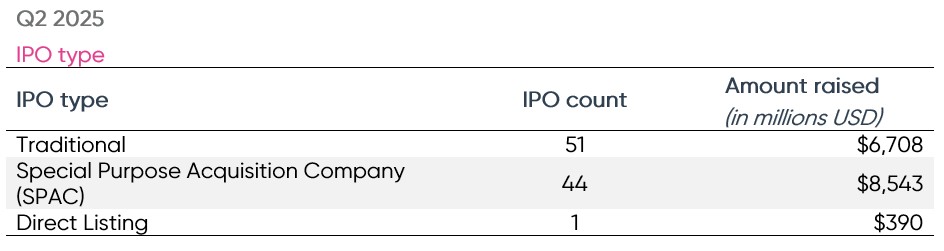 Traditional IPOs constituted the majority of initial public offerings this quarter. There were 51 traditional IPOs, representing about 53% of total public offerings for the quarter, over twenty percentage points lower than the proportion of traditional IPOs in Q1 2025.