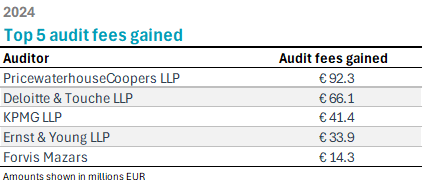 In terms of audit fee gains, PricewaterhouseCoopers ranked number one in 2024, gaining a total of €92.3 million from their new LSE clients. This was largely driven by the client acquisition of WPP, PLC at €53.1 million in audit fees.