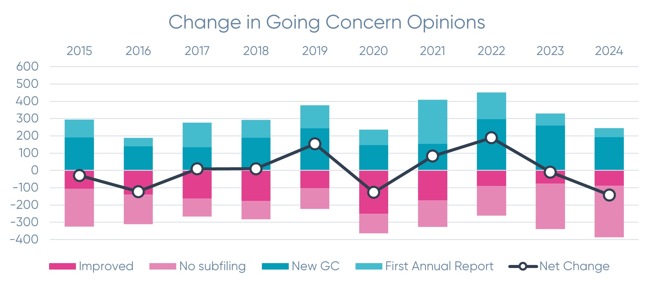 SEDAR going concern opinions experienced a net decrease of 142 in FY2024. Contributing to this net change was an addition of 193 new and 52 first going concern opinions and an attrition of 387 going concern opinions between FY2024 and FY2023. Unfortunately, 298 or 8% of the going concern opinions were due to no subsequent filings and just 89 or 1% were due to receiving a clean opinion from improved financial outlooks.
