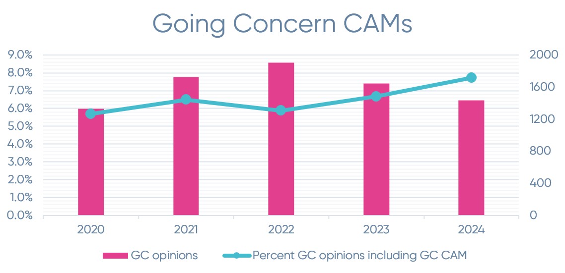 For the five-year period from 2020-2024, there were 8,044 opinions that included a going concern emphasis of a matter paragraph, of which only 6.5% of going concern opinions included a CAM related to the going concern.