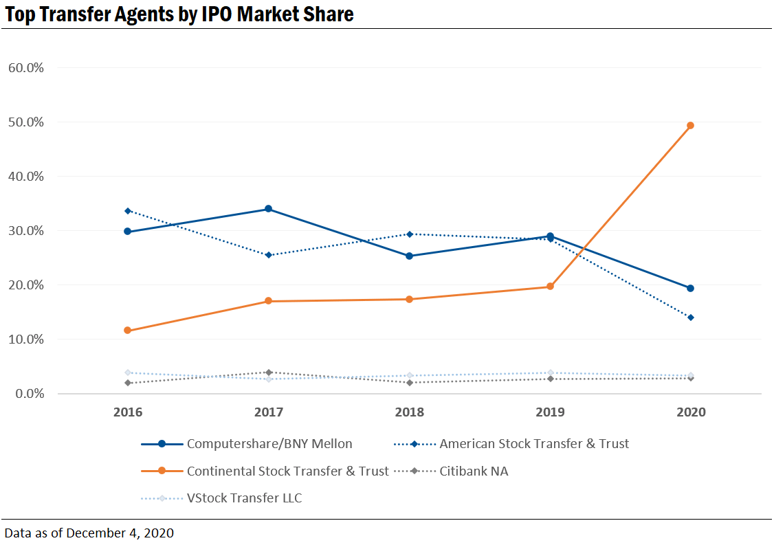 Similar to overall market share, there has been consistency among transfer agent market share for initial public offerings (IPOs). This year, however, Continental Stock Transfer & Trust moved into the spotlight, holding nearly 50% of the IPO market share.