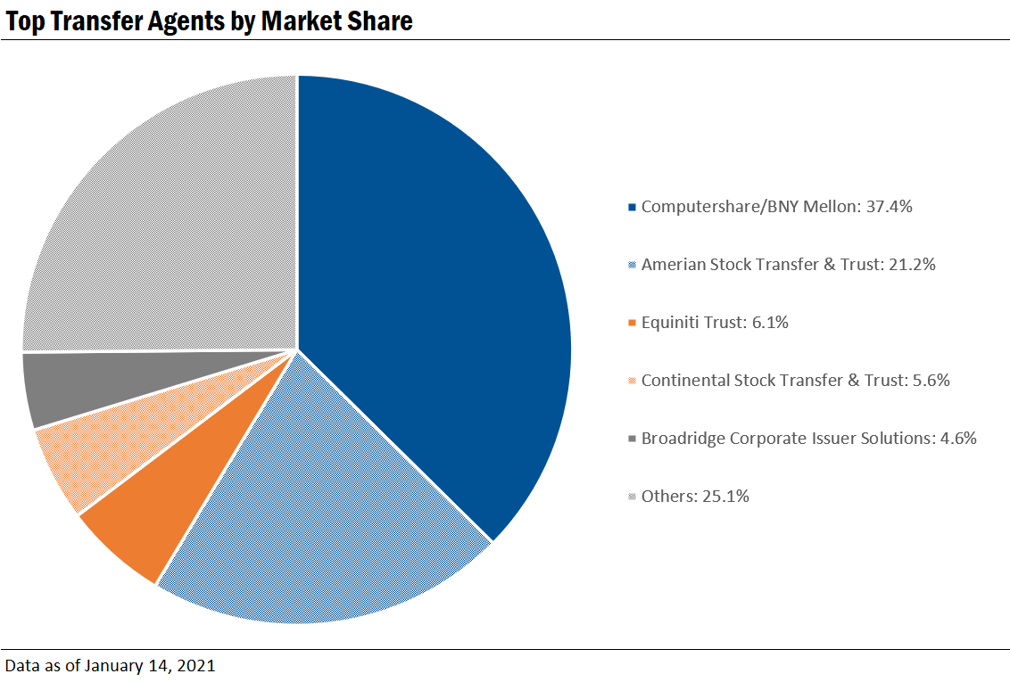 Note: The methodology used for this analysis was updated to remove open-end mutual funds and to remove companies that have not filed documents with the Securities and Exchange Commission (SEC) in over a year. Because of this change in methodology, all historical analyses related to market share of transfer agents have been removed.