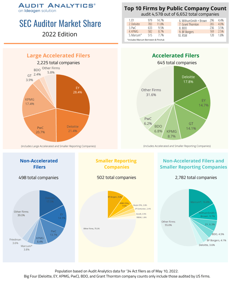 This is Audit Analytic's annual market share analysis of auditor engagements at public companies. Using our auditor engagements data, it looks at who is currently conducting audits of Securities and Exchange Commission (SEC) public registrants, based on reports filed with the SEC since March 2021.