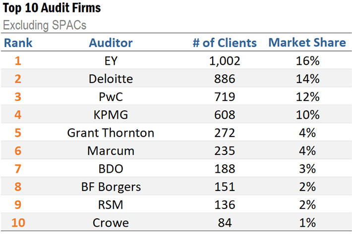 Collectively, these top 10 firms audit 69% of the public company market excluding SPACs.